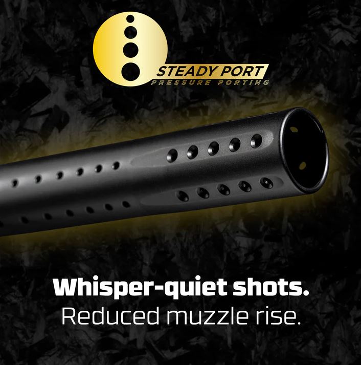 DYE’s signature porting pattern delivers whisper-quiet performance and reduces muzzle rise for a flatter, more controlled shot string.